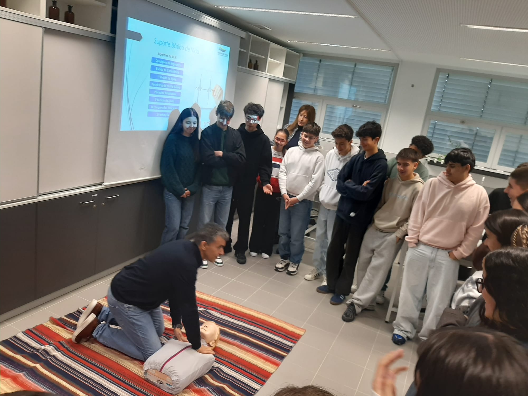 Sessões sobre Suporte Básico de Vida para os alunos do 9º ano, decorreram em sala de aula e estiveram sob a responsabilidade dos Enfermeiros Humberto Domingues e Ricardo Peixoto da Unidade de Cuidados na Comunidade de Viana do Castelo. Nestas sessões foram abordados uma sequência de procedimentos e atitudes que os jovens devem adotar numa ação de socorro.